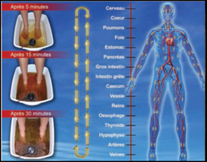 On place les pieds dans un bain d’eau salé où se trouve la cathode pendant environ 30 min durant lequel l’eau va prendre différentes couleurs ( orange, brun, vert, noir…), et se charger de certaines matières, déchets ou particules.Le corps composé d’environ 70% d’eau va permettre la circulations des ions en interne.